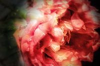 Papegaaitulp in verschillende tinten oranje en rood in het spel van licht en schaduw. De donkere achtergrond laat de zonovergoten bloem goed uitkomen. Ondersteund met textuur.