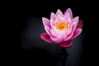 Charmante roze waterlelie met mooi kleurverloop en gele stamper. Hij rijst op uit het water en bloeit in prachtige roze kleurverlopen. De achtergrond is antraciet en zwart. Een elegant eenvoudig motief dat in het oog springt.