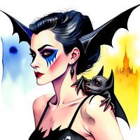 Dit kunstwerk is een betoverende weergave van mysterie en gratie, waarin waterverfeffecten worden samengesmolten met een vleugje gothic en een vleugje haute couture. In het middelpunt staat een vrouw met vleermuisvleugels die majestueus uit haar hoofd oprijzen, als een symbool van haar verbinding met de nachtelijke wereld en haar eigen…