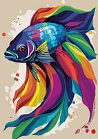 Dit pop-art portret van een Betta vis verandert onderwater gratie in een explosie van urban cool. Met zijn vinnen uitgespreid als kleurrijke zijde gevangen in de wind, wordt de vis tot leven gebracht in levendig roze, groenblauw en goudoranje, elke tint omlijst door gewaagde zwarte contouren. Speelse halftoontexturen geven een knipoog naar de vintage stripboekstijl, terwijl moderne kleurblokken het opvallend eigentijds maken. Dit kunstwerk, zowel sereen als woest, vangt de dualiteit van de Betta vis, waardoor het een gespreksonderwerp wordt voor iedereen die op zoek is naar unieke, opvallende muurdecoratie.