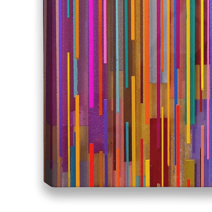 Abstracte kunst van kleurrijke verticale lijnen. De achtergrond bestaat uit kleurrijke verticale strepen die een ingewikkeld patroon vormen, wat een levendig en dynamisch visueel effect creëert. Elke streep heeft zijn eigen unieke kleurenpalet, wat diepte toevoegt aan de compositie.