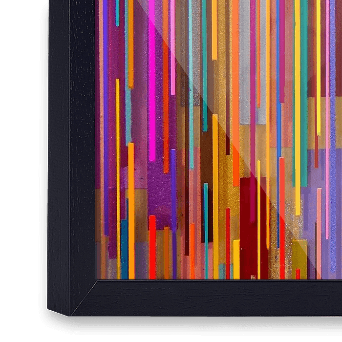 Abstracte kunst van kleurrijke verticale lijnen. De achtergrond bestaat uit kleurrijke verticale strepen die een ingewikkeld patroon vormen, wat een levendig en dynamisch visueel effect creëert. Elke streep heeft zijn eigen unieke kleurenpalet, wat diepte toevoegt aan de compositie.