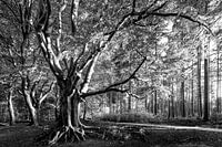 De iconische beuken op de Slotplaats in Bakkeveen. De grilligheid van de beuken in groot contrast met de rechte stammen van de dennen in de achtergrond. Om het grote contrast te benadrukken is de foto omgezet in contrastrijk zwart-wit.