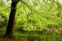 Een foto van een Beuk aan de rand van een vijver. Zijn takken hangen over het water om zoveel mogelijk licht op te vangen. Dit is in de Emmerdennen in Emmen. Het is voorjaar en de blaadjes zijn nog lichtgroen.