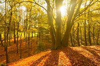 Oude beuken in een herfstbos in natuurgebied de Veluwe tijdens een zonnige dag in de herfst.