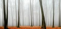 Beukenbos tijdens een mistige ochtend. De bosgrond is bedekt met bruine gevallen bladeren. De mist geeft het bos een desolate en welhaast depressieve atmosfeer. De Beuken staan in het Speulder- en Sprielderbos op de Veluwe. Foto met een dubbele belichting voor een wazig effect.
