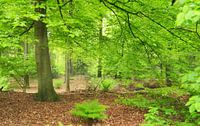 Een foto van een groen beukenbos in het voorjaar. Het landschap wordt overheerst door de lichtgroene bladeren van deze elegante loofbomen. Op de voorgrond staat ook een groene varen.