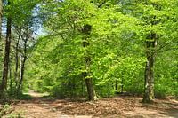 Een foto van Beukenbomen die in de lente verse nieuwe blaadjes hebben. Foto genomen in het bos in Emmen, Drenthe. De zon schijnt op het lichtgroene bladerdak van de grote beuken. Links loopt een pad verder het bos in.