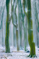 Beukenbomen met dramatische vormen in een nevelig en sneeuw bedekt Speulderbos tijdens een koude winterdag. De bosgrond is bedekt met sneeuw en gevallen bladeren. De lichte mist geeft het bos een desolate en deprimerende atmosfeer.