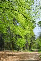 Een foto genomen in de Emmerdennen. Het is eind april en de grote Beukenbomen hebben net nieuwe bladeren. Met de zon op het bladerdak worden de blaadjes lichtgroen. Verschillende bospaadjes gaan alle richtingen op om met dit mooie weer van het lentebos te kunnen genieten.