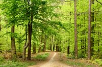 Een paadje loopt midden in het beeld het bos in. Het bos ligt in Emmen, de Emmerdennen. Aan weerszijden van het bospad staan Beukenbomen die net nieuwe bladeren hebben en die nog lichtgroen zijn. Omdat het pad aan de onderkant van het beeld begint zou dit heel mooi als behang op een muur gebruikt kunnen worden. Alsof je vanuit je huis zo het bos in kan lopen. Ik heb deze foto gemaakt tijdens bewolkt weer zodat er een mooi egaal verspreidt licht is zonder harde contrasten.