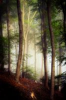 Hoge, slanke bomen rijzen op in een stil bos, hun stammen verdwijnen in een dichte, betoverende mist. Het zonlicht valt zachtjes door het bladerdak en baadt de omgeving in een kalm licht.