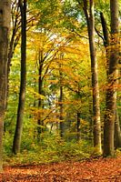 Een foto van beukenbomen in een beukenbos. De foto is gemaakt in de herfst en de blaadjes van de boom in het midden zijn al naar oranje aan het verkleuren. Op de boom rechtsvoor schijnt de zon.
