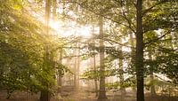 Beukenboslandschap tijdens een mistige herfstochtend. De bosgrond is bedekt met bruine gevallen bladeren terwijl er zonneschijn door de groene bladeren op de bomen komt.