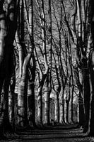 Een rij prachtige oude beuken in de winter met de zon die hun lichtgrijze stammen van opzij verlicht. Een zwart-witfoto van deze beschermde oude bomen, die groeien in een dubbele laan in het Mesenpark, Lede in Oost-Vlaanderen, België.