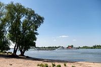 Beuningen Nederland The Netherlands. Aan de Beuningse Uiterwaarden runderen zitten inde schaduw van de bomen terwijl schepen varen richting Duitsland. On the Beuningse floodplains cattle rest in the shade of trees whilst ships pass by on the River Waal in the direction of Germany.
