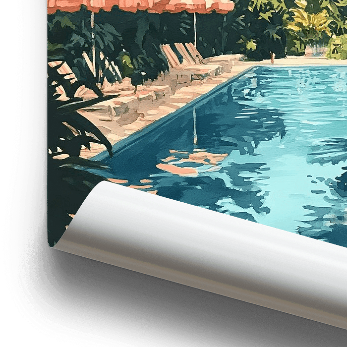 In dit kunstwerk wordt een zwembad in Beverly Hills tot leven gebracht in een mix van zomerse kleuren en tinten, die prachtig samensmelten en een zomerse sfeer oproepen.