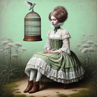 Wat een bijzondere portretten van vrouwen met een vogelkooi, wat is hier aan de hand? vrouwen in victoriaanse jurken, met een verdwaasde blik, die een vogelkooi op hun hoofd hebben, of waarbij het lijkt of ze er net van bevrijd zijn.