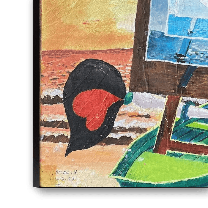 Het idee ontstond in een periode van persoonlijke reflectie, waarin de zee mijn emoties vertegenwoordigde en de duif stond voor helderheid. Ik koos voor heldere gelen, zachte oranje tinten en rustgevende blauwen om spanning en sereniteit met elkaar in balans te brengen. De groene boot, stevig verankerd maar klaar om te vertrekken, suggereert dat vrede iets is waarop we kunnen stappen — iets wat we bewust kunnen kiezen.