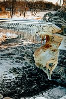 IJzige brug met lange ijspegels boven kolkend water. Sneeuw, textuur en winters licht geven een krachtig, contrastrijk beeld.