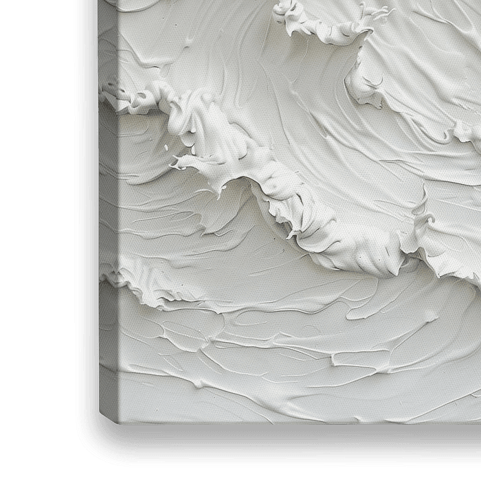 De golven lijken te bevriezen in het moment van hun kracht, met details die variëren van gladde, glanzende oppervlakken tot ruwe, geschuimde randen. Dit contrast voegt diepte en complexiteit toe aan het werk, en nodigt de toeschouwer uit om de tactiliteit en het ritme van de golven van dichtbij te verkennen. De keuze voor witte verf kan ook een gevoel van puurheid en sereniteit suggereren, waardoor het werk een meditatieve kwaliteit krijgt die de kalmerende maar krachtige aard van de oceaan weerspiegelt.