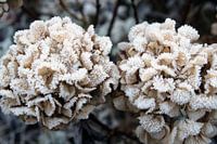 Vorst heeft de bloemen van de Hydrangea Macrophylla (Hortensia, tuinhortensia) voorzien van ijs, ijskristallen en rijp na een koude winternacht. Verwonderd kijk ik naar dit wintertafereel in de tuin: een oneindige hoeveelheid bevroren druppels, kleine witte sterretjes die glinsteren in het licht. Brocante vintage wintersfeer. Een sereen…