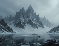 Een sereen maar indrukwekkend landschap dat wordt gedomineerd door grillige, besneeuwde toppen. Een stil, gedeeltelijk bevroren meer weerspiegelt de grootsheid van de bergen en creëert een gevoel van stille kracht en tijdloze schoonheid. Het gedempte kleurenpalet versterkt de sfeer van koude, frisse lucht en ongerepte wildernis.
