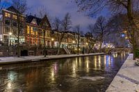 De Oudegracht in Utrecht bedekt met een laag ijs en sneeuw op de werven.