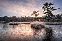 Deze foto is gemaakt in het vennengebied Hatertse en Overasseltse vennen (nabij Nijmegen, Nederland) op een koude ochtend. Het had die nacht bijna -10 graden gevroren waardoor er op korte tijd een laag ijs op het water was gevormd.