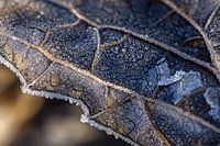 Deze close-up foto toont de prachtige structuur van een bevroren blad, bedekt met delicate ijs- en rijmdeeltjes. De ijskristallen geven het blad een sprankelend uiterlijk en onthullen de fijne details van de aderen in het blad, die normaal met het blote oog niet zichtbaar zijn. Het monochrome kleurenschema, met tinten van blauw, grijs en een vleugje goud, voegt een kalmerend en minimalistisch gevoel toe aan het beeld, waardoor het een prachtige aanvulling kan zijn voor moderne en rustgevende interieurstijlen. Perfect voor liefhebbers van de natuur en abstracte kunst, dit kunstwerk vangt de essentie van koude winterochtenden.