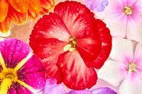 De bloemen zijn in het water gelegd en bevroren. Daarna besprenkeld en opnieuw ingevroren voor het beste resultaat van zachte pasteltinten, frisse kleuren, fijne details en doorzichtigheid van de bloembladeren. Het is een foto en er is geen trucage of schilderkunst toegepast om het uiteindelijke resultaat te bereiken van eenvoud, natuur en zomerse kleuren.