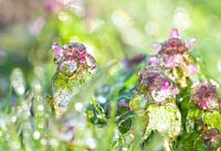 Bevroren bloemen in het gras. IJs in de vroege lente in de natuur. Natuurlijke kleuren groen en Paars.