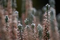 Een close-up van bevroren bloeiende heide op een koude december ochtend.
