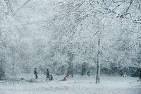 Indruk van de eerste sneeuwval. Ik wilde een ouderwets ogend tafereeltje van een familie in de sneeuw ,met een schilderachtig ,grafische sfeer.