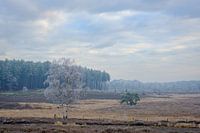 Een bevroren landschap met berkenboom, denneboom en bos onder een bewolkte winter ochtend op natuurreservaat De Teut in Zonhoven (België)