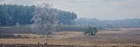 Een bevroren landschap met berkenboom, denneboom en bos onder een bewolkte winter ochtend op natuurreservaat De Teut in Zonhoven (België)