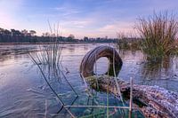 Een gedraaide tak steekt uit het ijs van een bevroren ven op natuurreservaat De Kampina, op een winterse ochtend.