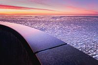 Zonsopkomst bij een bevroren IJsselmeer, waarbij de lucht prachtige roze en oranje kleuren laat zien. Prachtige pastelkleuren boven een ijskoud pool landschap in de Nederlandse natuur. Uitzicht vanaf het monument op de afsluitdijk met eindeloze ijsschotsen tijdens de zonsopkomst in de vroege ochtend.