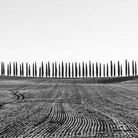 Het is een zeer bekende fotografische locatie, de cipressen van Poggio Covili, maar bij deze gelegenheid was ik in staat om een origineel moment vast te leggen, dankzij de texturen van de onlangs ingezaaide gewassen en het sterke contrast tussen de grond en de kleine planten als gevolg van de ochtendvorst.