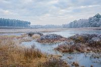 Een bevroren vijver in een ven op een bewolkte winter ochtend op natuurgebied de Teut in Zonhoven (België).