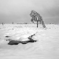 In een uitgestrekt winterlandschap staat een eenzame boom, diep gebogen onder het gewicht van ijs en sneeuw. Voor de boom slingert een bevroren beekje door het landschap, zijn donkere oppervlak zichtbaar onder zachte, witte sneeuwlagen. De lege omgeving, gehuld in een monochroom palet van grijs en wit, straalt een diepe stilte uit. De…
