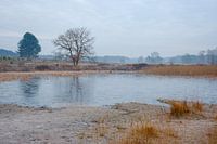 Een bevroren vijver met bomen op de achtergrond op een winter ochtend onder een bewolkte lucht op natuurreservaat De Teut in Zonhoven (België)