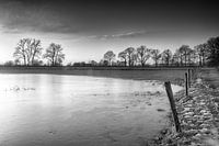 Zwart-wit foto van een grote bevroren plas water in de uiterwaarden nabij kasteel Amerongen.