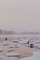 Fine art fotoprint in pasteltinten van een besneeuwd en bevroren landschap in Zweeds Lapland.