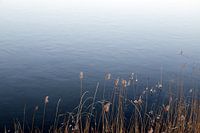 Licht bevroren meergras aan de oever van een bevroren meer.