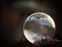 Een bevroren zeepbel. Als de temperatuur onder de min 3 zakt en er weinig wind is dan bevriezen de zeepbellen. Het water tussen de zeepmoleculen bevriest en laat prachtige ijsbloemen zien op het dunnen bevroren vlies. Zo maakt de natuur haar eigen, ijzige, abstracte kunst