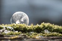 Macrofoto van een bevroren zeepbel in mijn achtertuin. De bel ligt op de rand van mijn vijver op het mos.