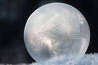 Een zeepbel is bevroren. De delicate structuren van het ijs zijn duidelijk zichtbaar. De achtergrond is zwart. De zon schijnt op de zeepbel. De zeepbel ligt op sneeuw