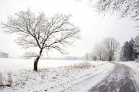Dooi op de bomen, sneeuw op de velden en grijze luchten: een winterse dag in de buurt van Soltau-Ahlften, Heidekreis. Lüneburger Heide, Nedersaksen, Duitsland. Januari 2016.