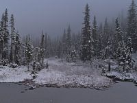 Landschapsopname van een bos in de winter met besneeuwde coniferen die verdwijnen in de mist en een bevroren meer in de Rocky Mountains in Jasper National Park, Alberta, Canada.